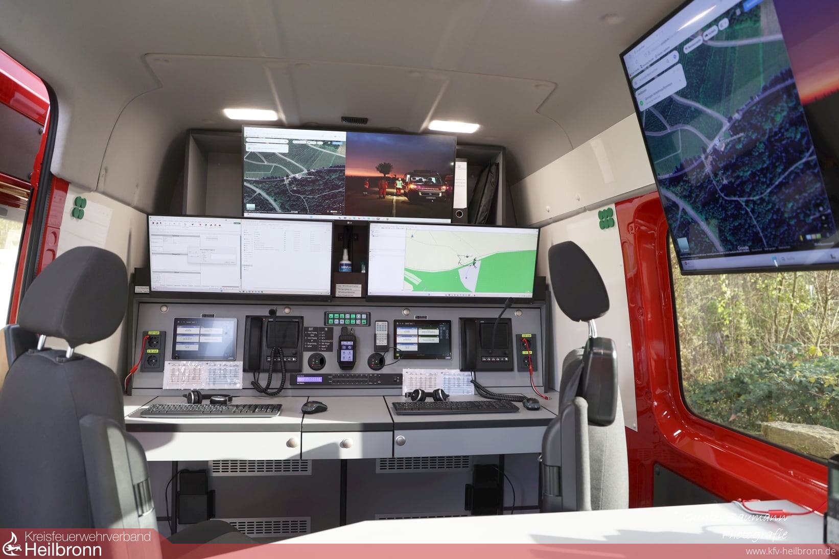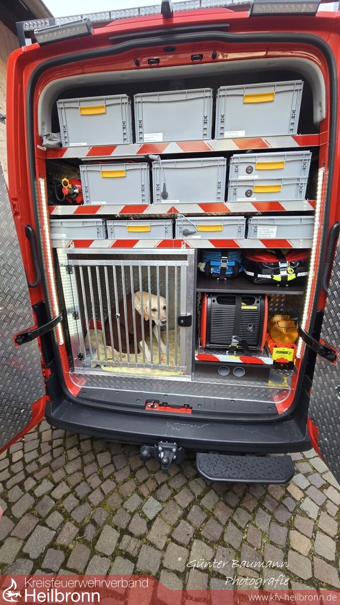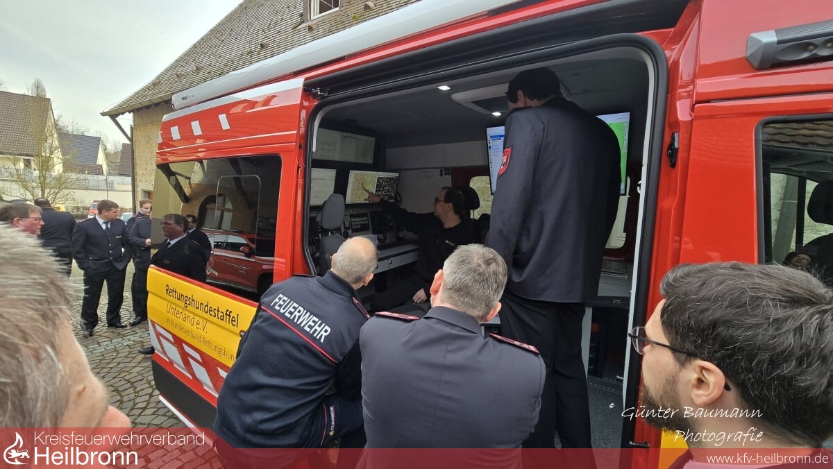 Im Anschluss an den Vortrag konnte der neu in Dienst gestellte Einsatzleitwagen ELW1 besichtigt werden. Großes Interesse fand hier die Online-Visualisierung der Standorte der Rettungshundeteams sowie die Lagedarstellung über einen eingebauten Monitor an der Innenscheibe des Fahrzeuges.