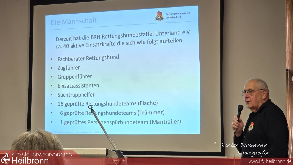 Auf Einladung des Kreisbrandmeisters Torsten Rönisch konnte sich die Unterländer Rettungshundestaffel in einem 1½-stündigen Vortrag präsentieren und sich den zahlreichen Fragen der Führungskräfte stellen.