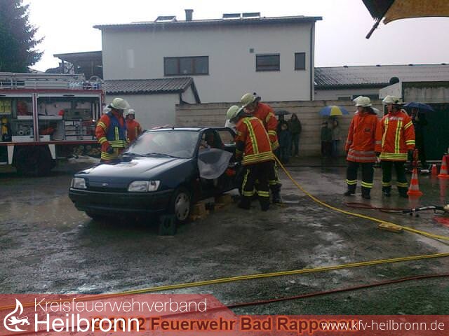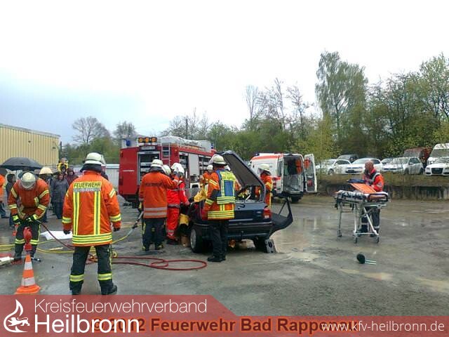 Am Sonntagnachmittag gegen 15 Uhr konnten viele Besucher der \"Autoaction 2012\" bei strömendem Regen eine gemeinsame Rettungsübung des DRK OV Bad Rappenau-Siegelsbach und der Feuerwehr Abt. Bad Rappenau miterleben.