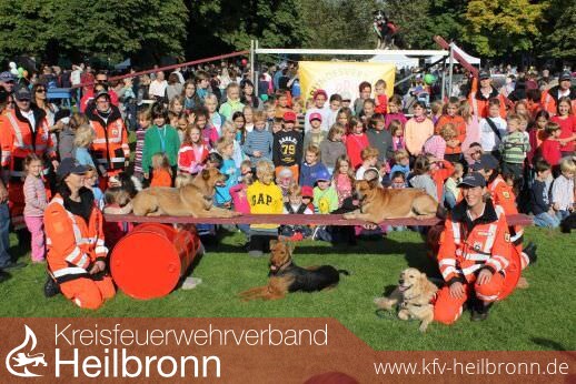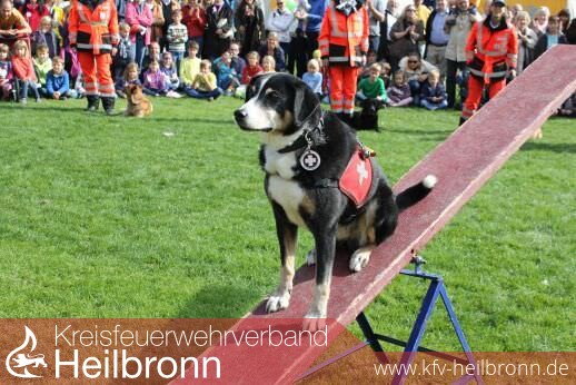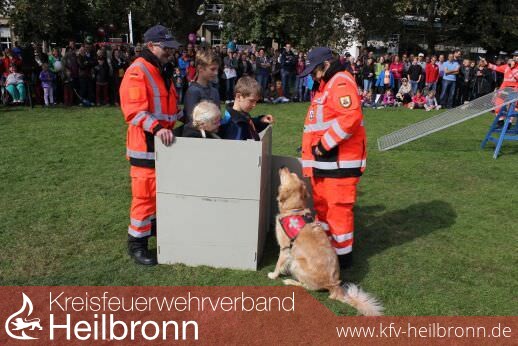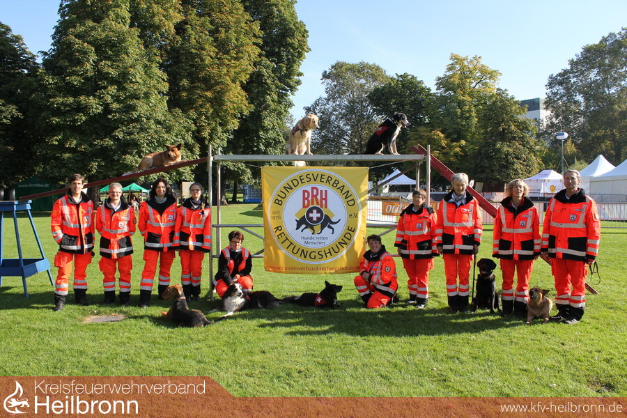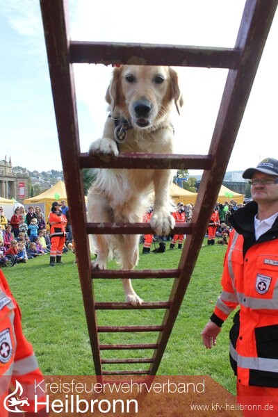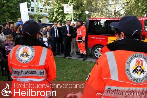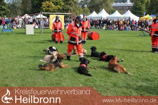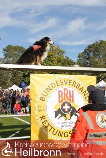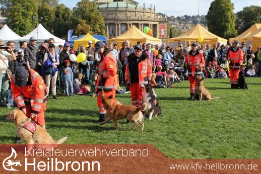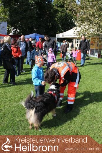 Bürgerfest zum Tag der deutschen Einheit in Stuttgart, das Wetter perfekt, die Atmosphäre locker, die Stimmung der ca. 500.000 Besucher so heiter wie das Wetter. Unter diesen idealen Rahmenbedingungen konnte die RHS Unterland auf der „Blaulichtmeile“ des Bürgerfestes den Bundesverband Rettungshunde (BRH) repräsentieren. Mit einem Infostand und insgesamt 4 Vorführungen gab die Staffel Einblick in die Arbeit der Rettungshundestaffeln. Ca. 1000 begeisterte Zuschauer pro Vorführung waren für die Staffelmitglieder große Motivation in kurzen Ausschnitten aus Unterordnung, Gerätearbeit, Ausbildung der Junghunde und anschließend kurzen Anzeigen der Rettungshunde an kleinen Verstecken die ehrenamtliche Arbeit der Rettungshundeführer und ihrer Hunde zu zeigen. Am Infostand und Einsatzfahrzeug konnten viele Fragen der interessierten Bürger beantwortet werden. Auch Innenminister Reinhold Gall schaute kurz vorbei und zeigte sich von der Arbeit der Rettungshunde sehr beeindruckt. Highlights für die Kinder waren aber auf jeden Fall die kleinen Suchen der Rettungshunde, die die versteckten Kinder freudig anzeigten und natürlich der „Streichelzoo“, wo alle Hunde sich genüsslich von vielen hundert Kinderhänden kraulen ließen.