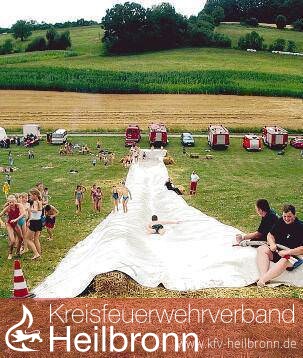 100 Strohballen, zwei Anhänger voll Stroh, drei Eimer Schmierseife, eine lange Folie und viel Wasser. Das ist das Baumaterial, um eine Wiese in eine 60 Meter lange Wasserrutschbahn für 150 Kinder zu verwandeln. Man nehme außerdem 18 Feuerwehrmänner und 25 Helferinnen und Helfer der Jugendfeuerwehr für den mehrstündigen Auf- und Abbau der Anlage. Auch das anfangs noch regnerische Wetter tat der Begeisterung der Kinder keinen Abbruch. Mit den Feuerwehrfahrzeugen wurden die Kinder zu der beim Aussiedlerhof Fleischmann gelegenen Wiese gebracht.