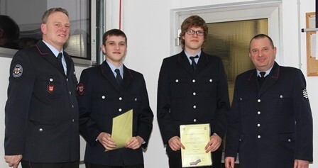 Bild 2: Beförderungen bei der Obereisesheimer Feuerwehr: (von links) Abteilungskommandant Werner Seufer, Vincenz Lang, David Selbmann und Kommandant Wolfgang Rauh.