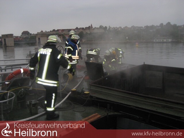 Unter Atemschutz gehen unverzüglich Trupps zur Personensuche und Brandbekämpfung auf das Schiff vor, während zeitgleich die Rettungsboote von Feuerwehr und DLRG, sowie das Mehrzweckboot der Feuerwehr mit TS-8 in den Neckar eingesetzt werden.