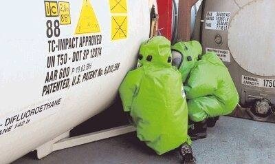 Abgedichtet Innerhalb von Minuten ist das Leck von den Männern in den grellgrünen Anzügen abgedichtet. Zur Sicherheit steht ein Tanklöschfahrzeug mit 6000 Litern Wasser bereit. "Die Taktik ist erstmal Stabilisieren, so dass nichts mehr ausläuft", erklärt Dieter Friedrich, Leiter der Werkfeuerwehr.