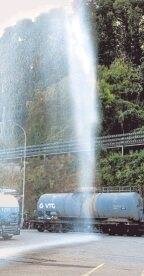 Bild 1: Nie ohne Schutzkleidung beim Umgang mit gefährlichen Stoffen. Feuerwehrleute reparieren in einer Übung das Leck in einem Container.Bild 2: Wasserwand: Überall im Werk sind automatische Feuerlöscher installiert. (Fotos: Ulrike Kugler)