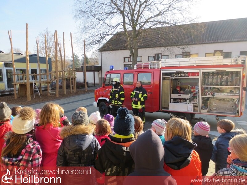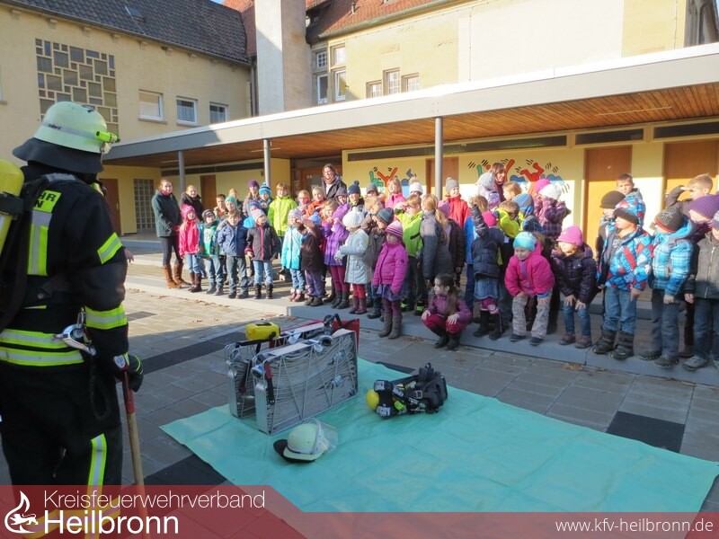 Im Pausenhof warteten drei Feuerwehrmänner der Feuerwehrabteilung Mühlbach mit dem Löschgruppenfahrzeug LF 8/6 auf die Kinder. Uwe Daubenthaler, Mathias Schaupp und Bernd Reimold, zeigten den Schülern und Lehrern einige Ausrüstungsgegenstände aus dem LF 8/6, hier wurde in erster Linie die komplette Atemschutzausrüstung eines Feuerwehrmannes vorgestellt und angelegt. Zahlreiche Fragen der interessierten Schüler wurden gerne beantwortet. Anschließend führten die Feuerwehrmänner im Schulhof eine Fettexplosion vor. Hier war eindrucksvoll und live zu sehen, was passiert wenn in einer haushaltsüblichen Bratpfanne brennendes Fett in Berührung mit Wasser kommt. Es entsteht hier eine enorme Fettexplosion, die sich z. B. in einer Küche rasch zu einem Zimmer oder Küchenbrand entwickeln kann. Die Kinder waren sich schnell einig: Brennendes Fett niemals mit Wasser löschen. Am besten einen Deckel darauf legen, oder eine Löschdecke verwenden und so das Feuer ersticken und gleichzeitig die Feuerwehr verständigen.