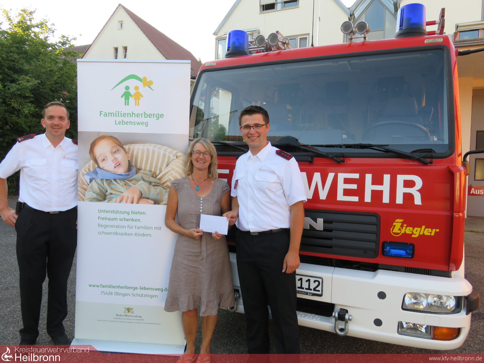 Die Mannschaft des Silbernen Leistungsabzeichens der Feuerwehr Schwaigern (mit Abteilungen) spendete Ihre Gruppenkasse am vergangenen Montag der Familienherberge Lebensweg. Hierfür trafen sich Gruppenführer Sandro Esslinger und Maschinist Felix Sailer mit der Initiatorin & Geschäftsführerin Karin Eckstein am Gerätehaus der Abteilung Stetten a.H., um die Geldspende zu überreichen.