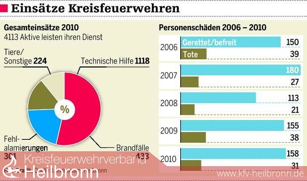 Großbrand in Löwenstein, schwerer Verkehrsunfall mit drei toten jungen Fußballern zwischen Kirchardt und Bad Rappenau-Fürfeld, Unwetter, Personensuche 2076 Mal rückten die Freiwilligen Feuerwehren des Landkreises Heilbronn im vergangenen Jahr aus, um Menschen in Not zu helfen. Das ist eine Steigerung im Vergleich zu 2009 um 23 Prozent (Grafik).