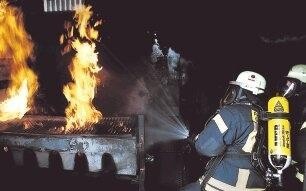 Man stelle sich vor: Zwei Feuerwehrleute steigen in voller Ausrüstung mit Atemschutz und Funk in diesen Container, müssen sich über eine in Flammen stehende Wendeltreppe weiter nach vorne kämpfen und dort weitere Brände am Elektroschrank, einem Bett und einer Gasleitung löschen.