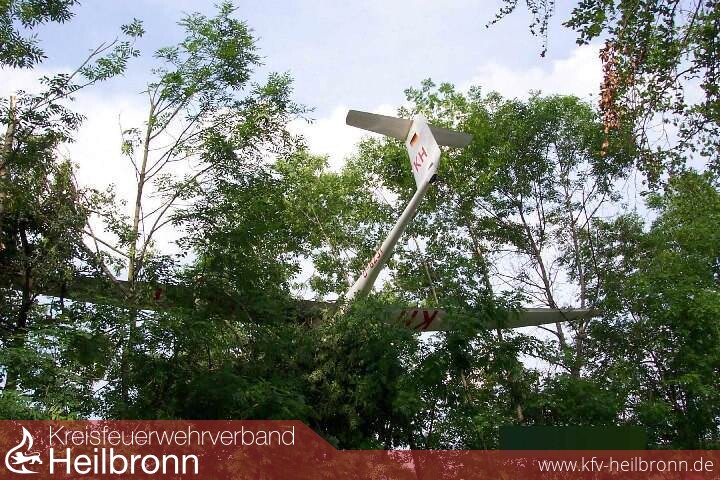 In der Nähe des Chaussehauses bei Wüstenrot blieb ein Segelflugzeug, beim Versuch einer Außenlandung, in mehreren Bäumen hängen.