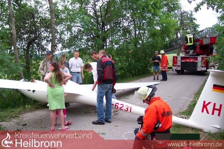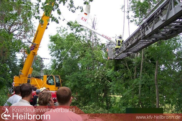 Da das Flugzeug mit den vorhandenen Leitern nicht sicher erreicht werden konnte, wurde die Drehleiter aus Weinsberg zur Unterstützung angefordert.