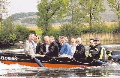 Bild: Eine Bootsfahrt die ist lustig: Die Bürgermeister Murso (links) und Thoma (2.v.l) genießen mit Pfarrer Steg (4.v.r), Feuerwehr und DLRG die Jungfernfahrt (Foto: Döttling)