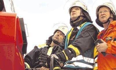 Bild 1: Thomas Piehler (links) aus Brackenheim fährt den Korb der Drehleiter aus, daneben sein Kollege Claus Baumann mit Einsatzleiter Albert Decker.