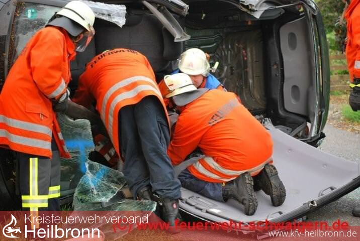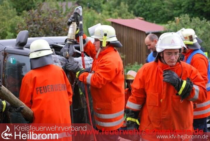 Die verletzte Person aus dem verunglückten Ford zu retten, ist indes für die Wehrmänner aus Massenbach eine harte Nuss. Während die einen das Fahrzeug stabilisieren, lösen die anderen mit der hydraulischen Schere das Fahrzeugdach. \"Wer gerade frei ist, soll helfen, das Lenkrad wegzuziehen\", fordert Schweizer seine Kollegen auf. Diese nehmen den Spreizer zur Hilfe. Die Person mit einer schweren Bauchverletzung wird gerettet.