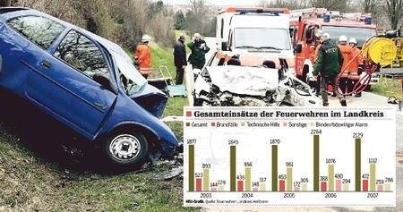 Deutlich wird das an den Zahlen, die Vogel für 2007 präsentierte. Zu technischer Hilfe - also meistens Unfälle - rückten die Wehren 1112 Mal aus. 1076 waren es im Jahr zuvor gewesen. 472 Mal brannte es. Vergleich zum Vorjahr: 388. Die Großbrände nehmen zu. 29 waren es 2007, im Vorjahr nur halb so viel.