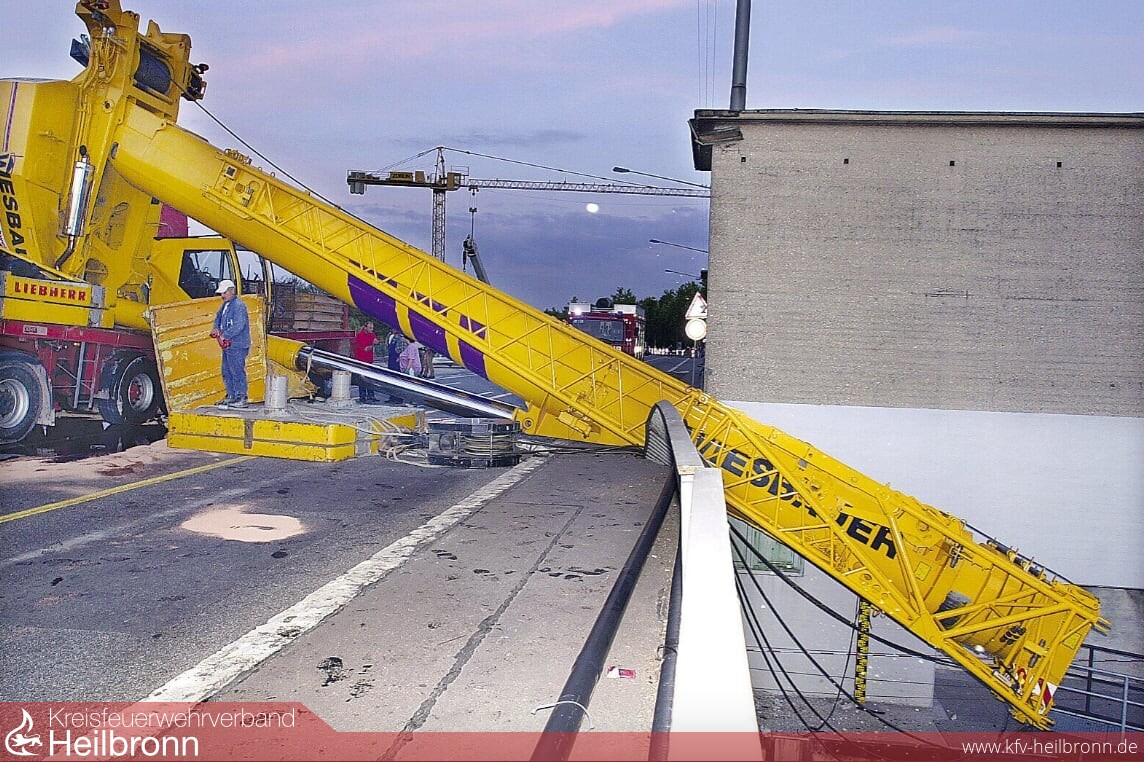 2003: Ein tonnenschwerer Autokran stürzt auf der Baustelle der Otto-Konz-Brücke in Heilbronn um. Zwei Menschen werden verletzt. Einem Bericht der Heilbronner Stimme zufolge soll der Kran aufgebaut werden, als er beim Versuch, seine eigenen Gegengewichte von einem Lastwagen aufzuladen, ins Kippen kommt. Er stürzt auf die Fahrbahn, der stählerne Ausleger drückt das Geländer der Otto-Konz-Brücke nieder und fällt ins Schleusenbecken. Die Feuerwehr bindet ausgelaufenes Hydrauliköl. Die Bergung des Krans dauert mehrere Stunden.