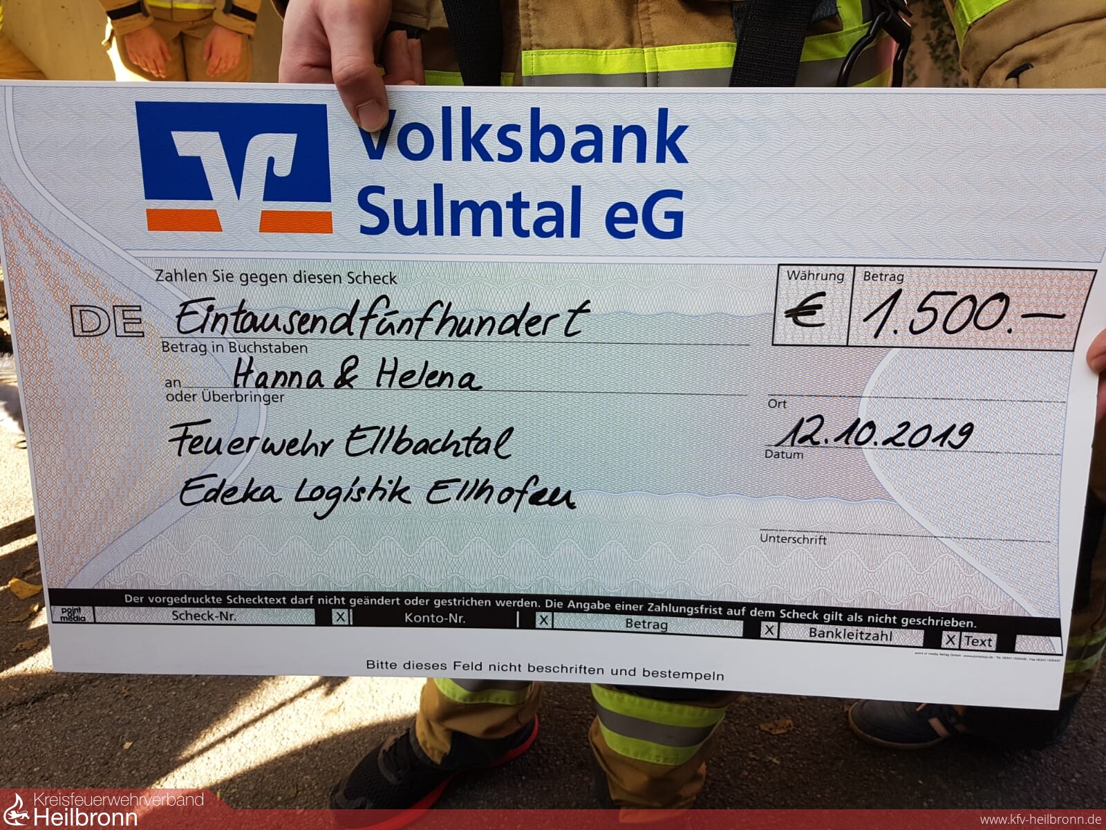 Spontan haben wir uns auch im Vorfeld entschieden, einen größeren Betrag aus der Kameradschaftskasse zu spenden. Unsere 500 € wurden durch unglaubliche weitere 1000 € von Edeka Logistik aufgerundet. Unter großem Applaus durften wir am Ende der Veranstaltung den Spendenscheck über 1.500 € an die Familie überreichen.