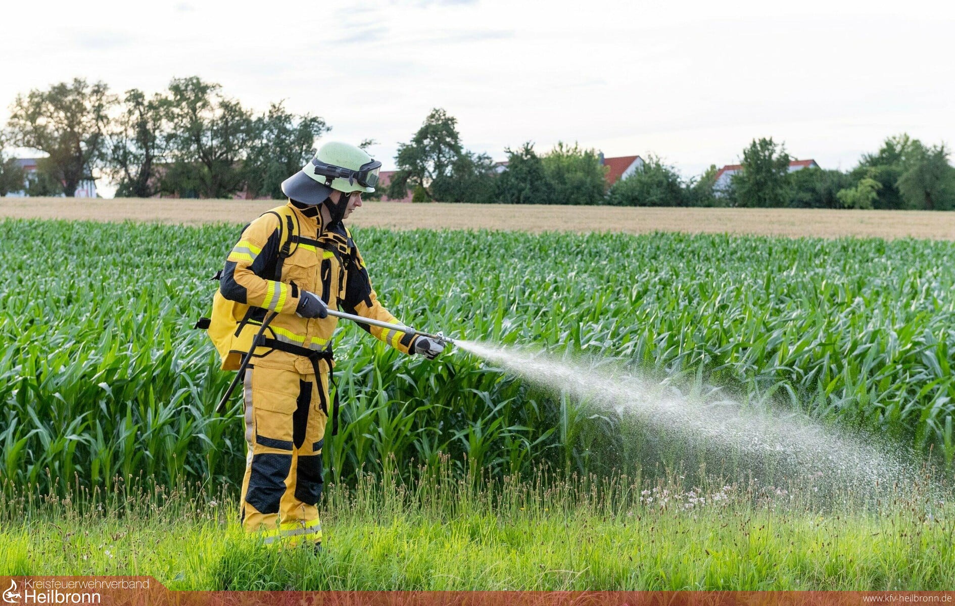 Thomas Bujara schultert den gelben Rucksack, der mit 20 Litern Wasser gefüllt ist. Er demonstriert, wie es funktioniert. Mit dem Handstrahlrohr pumpt er den Inhalt heraus und kann so in unwegsamem Gelände Feuer im Wald, auf Wiesen oder Feldern zu Leibe rücken. „Das ist auch nicht anstrengender, als ein Atemschutzgerät zu tragen“, meint der junge Feuerwehrmann. Zudem pumpe man nicht kontinuierlich, sondern punktuell. Bujara gehört zu den 25 der 50 Einsatzkräfte der Feuerwehr Ellbachtal, die für Vegetationsbrände geschult und ausgerüstet werden. Es ist eine neue Sondereinheit im Landkreis Heilbronn. Sie kann künftig die örtlichen Feuerwehren bei Einsätzen in der Landschaft unterstützen, anleiten und ausrüsten.