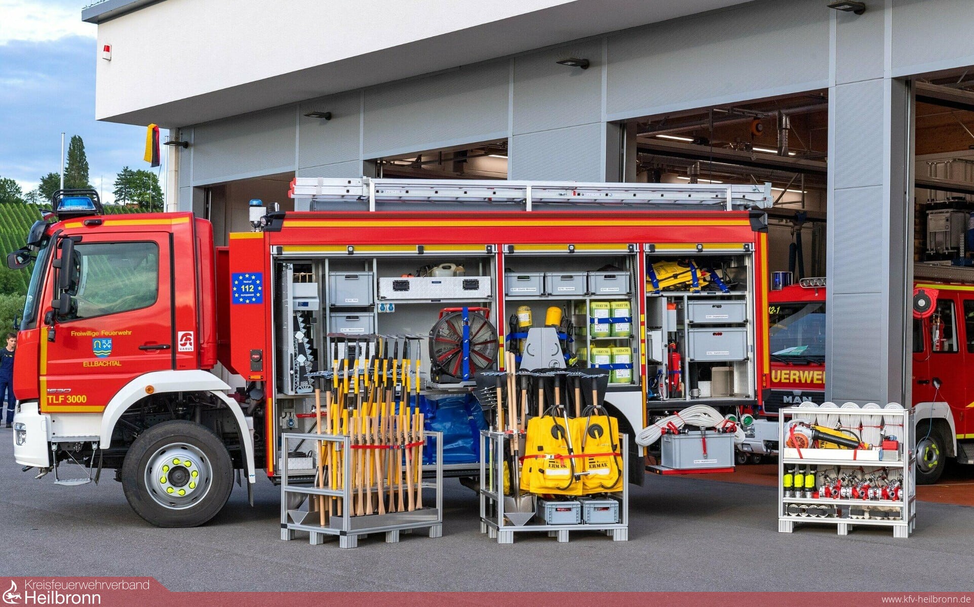 Das 2019 vom Feuerwehr-Zweckverband der Kommunen Ellhofen und Lehrensteinsfeld für 388 000 Euro angeschaffte Tanklöschfahrzeug 3000 hat eine Grundausstattung für Vegetationsbrand. Dazu kommen drei Systempaletten, die der Gerätewagen Logistik transportiert. Eine vierte Palette wird noch geliefert, so dass 60 Leute mit Material ausgestattet werden können. An der Front hat das TLF einen Löschbalken, der aus vier Düsen mit hohem Druck einen Wassernebel sprüht.