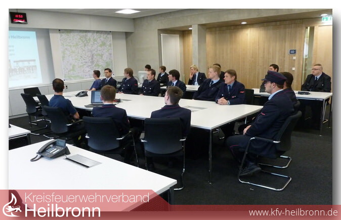 Abgerundet wurde der Lehrgang durch einen Besuch in der Integrierten Leitstelle des Landkreises Heilbronn. Als eine der ersten Gruppen konnten die Lehrgangsteilnehmer die Leitstelle besichtigen und erfuhren aus erster Hand wie der Arbeitsablauf dort aussieht. Markus Wetteskind von der Berufsfeuerwehr Heilbronn stand für alle Fragen kompetent zur Verfügung und erläuterte den Lehrgangsteilnehmern den genauen Weg für eine Alarmierung ihrer Feuerwehr im Ernstfall anhand der Alarm- und Ausrückeordnungen.