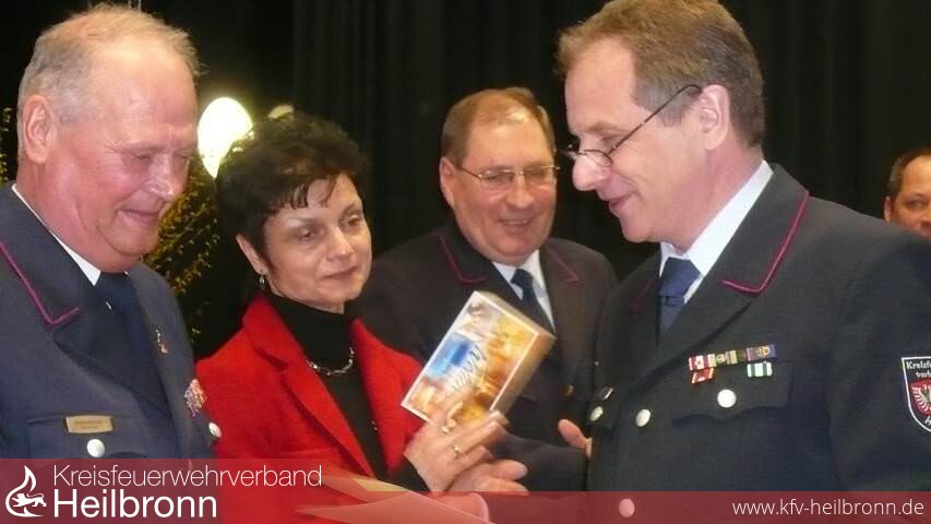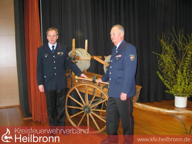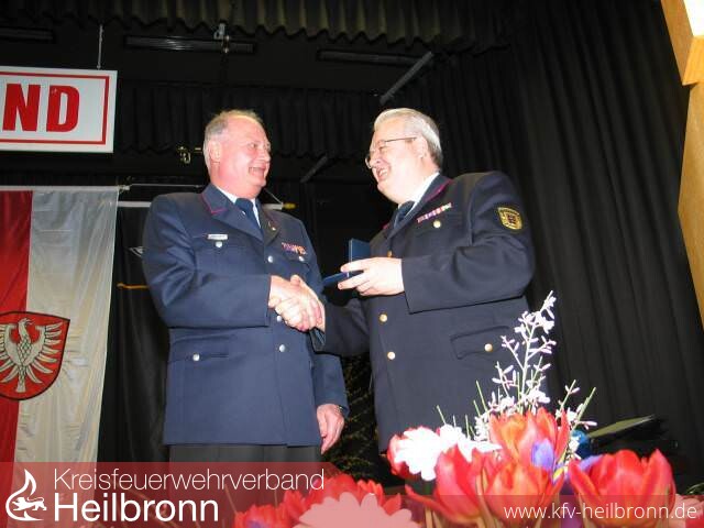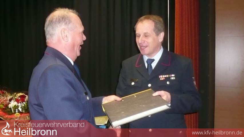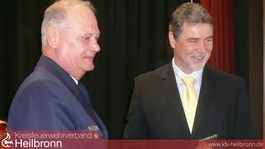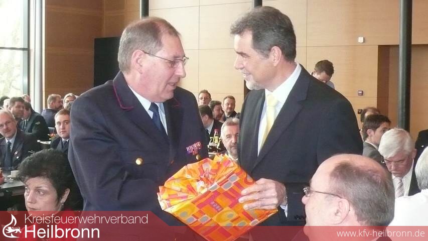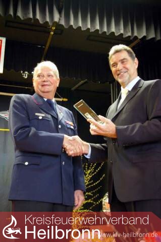 Reinhold Gall dankte den beiden scheidenden Vorstandmitgliedern in launigen Worten. Hermann Jochim war nicht nur ein Papierstellvertreter sonder ein aktiver Mitstreiter, so Gall. Für seine Verdienste wurde er zum Ehrenmitglied des Kreisfeuerwehrverbandes ernannt. Anschließend stellte er noch einmal die Verdienste von Korb als Verbandsvorsitzender heraus. Nicht nur im Stadt- und Landkreis, sondern im ganzen Land habe er Spuren hinterlassen. Dafür ernannte er Reinhold Korb zum Ehrenvorsitzenden des Kreisfeuerwehrverbandes.