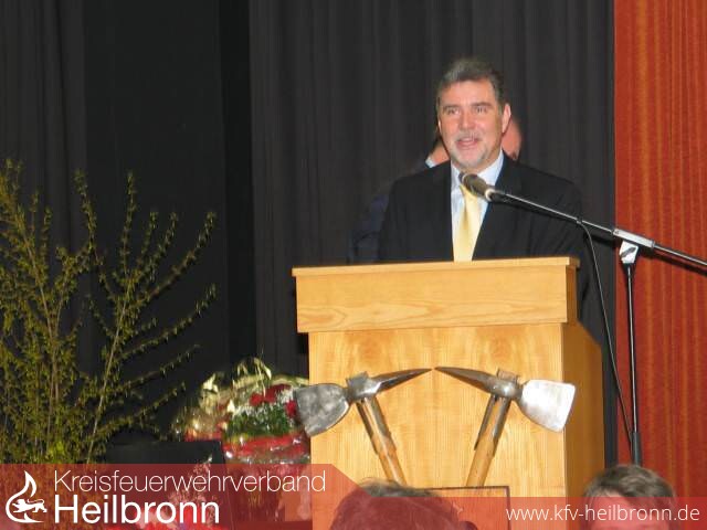 Bürgermeister Claus Brechter stellte in seinen Grußworten Bad Wimpfen und seine Feuerwehr mit ihren Besonderheiten, wie der Hanglage am Neckar und dem Kurbetrieb vor. Mit Blick auf den demographischen Wandel in der Bevölkerung ermunterte er die Feuerwehren sich künftig noch stärker um die Nachwuchsgewinnung zu kümmern. Er stellte heraus, dass Reinhold Korb in seiner nun fast 35-jährigen Kommandantentätigkeit auch ein großes Stück in der Geschichte der Wimpfener Feuerwehr geprägt hat.