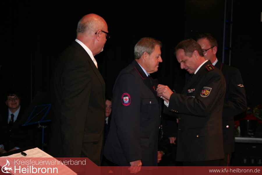 Reinhold Gall, der Vorsitzende des Kreisfeuerwehrverbandes Heilbronn zeichnet mit Bürgermeister Ulrich Ruoff und Kommandant Sven Kübler Josef Denzer mit dem Feuerwehr-Ehrenzeichen in Gold für 40 Jahre aktive Dienstzeit aus.