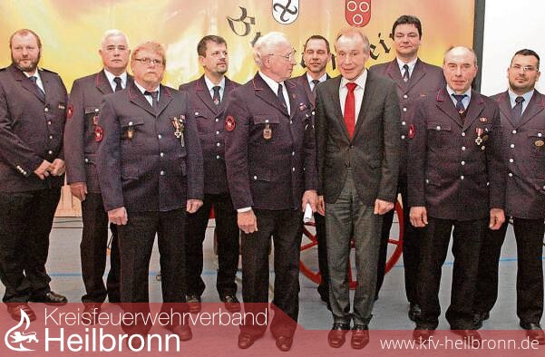 Bild: Kommandant Peter Hügle (r.), mit Bürgermeister Rolf Kieser und Ehrenkommandant Kurt Sommer (Mitte) und weiteren Kameraden. (Foto: Gerhard Dubinyi)