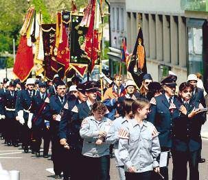 Auch Frank Knödler, Präsident des Landesfeuerwehrverbands, und Landesbranddirektor Hermann Schröder sind dabei, natürlich auch viele Blauröcke aus der Region Heilbronn. Stolz halten Michael Reiß aus Bad Friedrichshall und Gerald Stadtmüller aus Erlenbach ihre schmucke Fahne, die nur zu besonderen Anlässen gezeigt wird. ?Fahne Neckarsulm bitte?, ruft Rönisch, der die feierliche Prozession zur katholischen Kirche zusammenstellt.