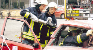 Projektleiter Metzger setzte sich in einen Unfallwagen, um dann von den Feuerwehrleuten gerettet zu werden. Übungsleiter Roth erklärte dabei jeden Handgriff seiner Auszubildenen. Zuerst wurde das Fahrzeug gesichert und am Wegrollen gehindert. Dann entfernten sie die Fenstergläser und stemmten die Türen auf. Zum Schluss entfernten sie das Dach des Fahrzeugs, um das Unfallopfer vorsichtig herauszuheben.