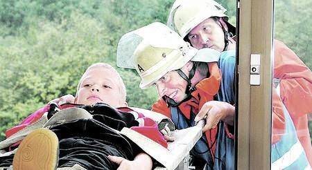 20 Minuten später gleicht der Südhügel des Krankenhausgeländes einem kleinen Katastrophengebiet. 45 Sanitäter haben drei große Zelte aufgestellt. Und während die Einsatzleitung im großen Kommandowagen die nächsten Schritte koordiniert, holt eine Hand voll Feuerwehrmänner mit der Drehleiter einen geflüchteten Patienten vom Dach. Ihre Kameraden suchen zur gleichen Zeit nach Verletzten im Keller und retten Patienten auf der Station im dritten Obergeschoss.