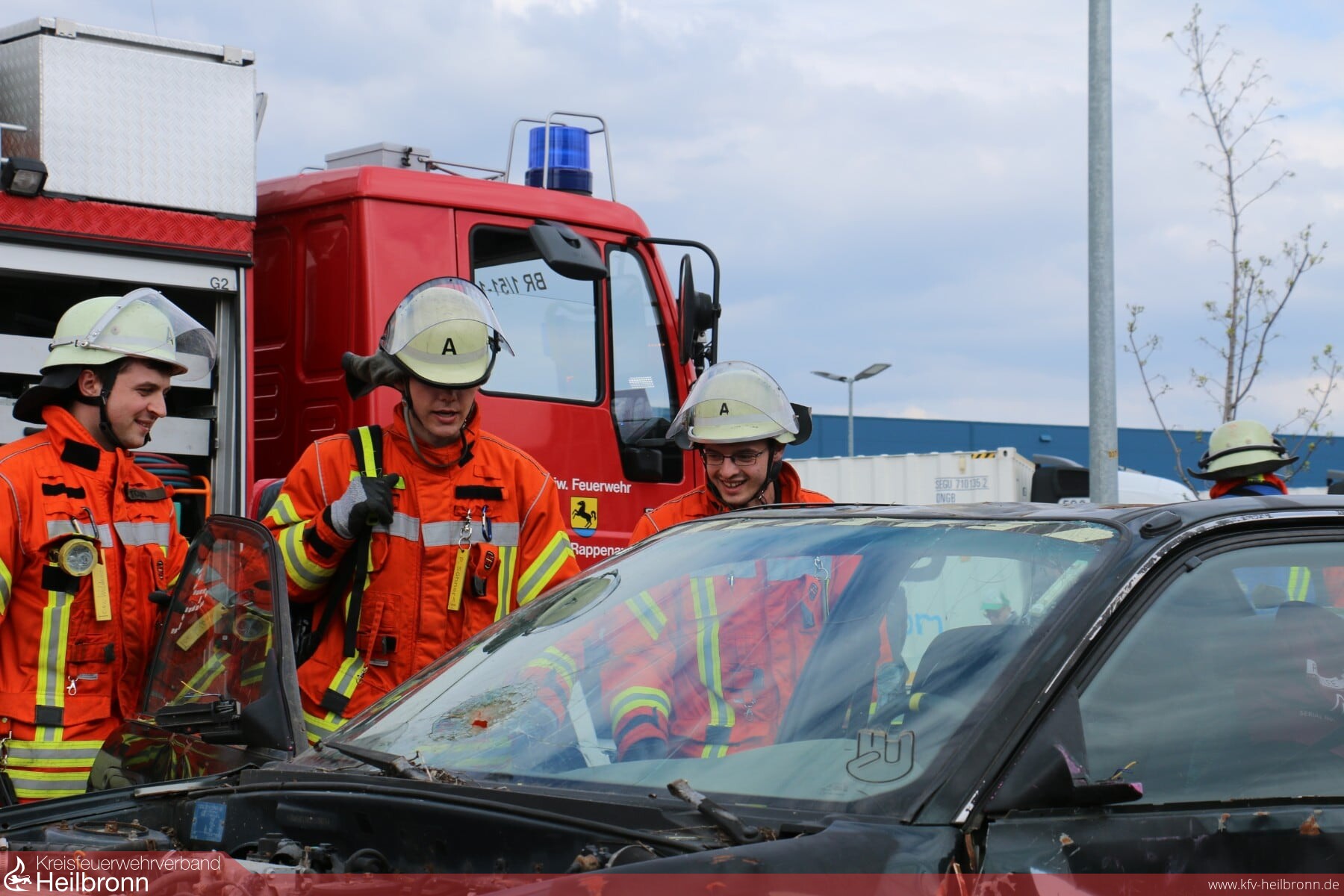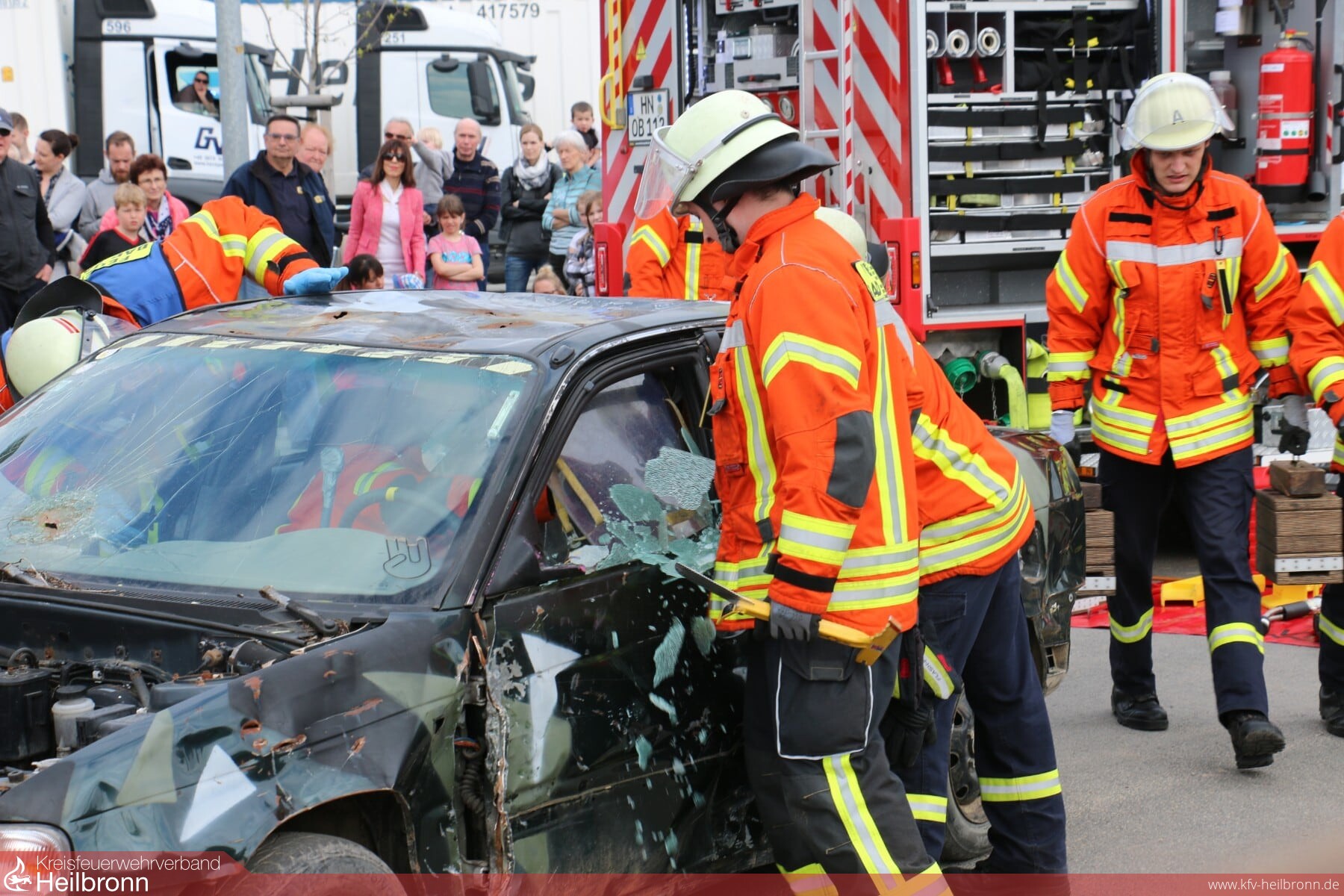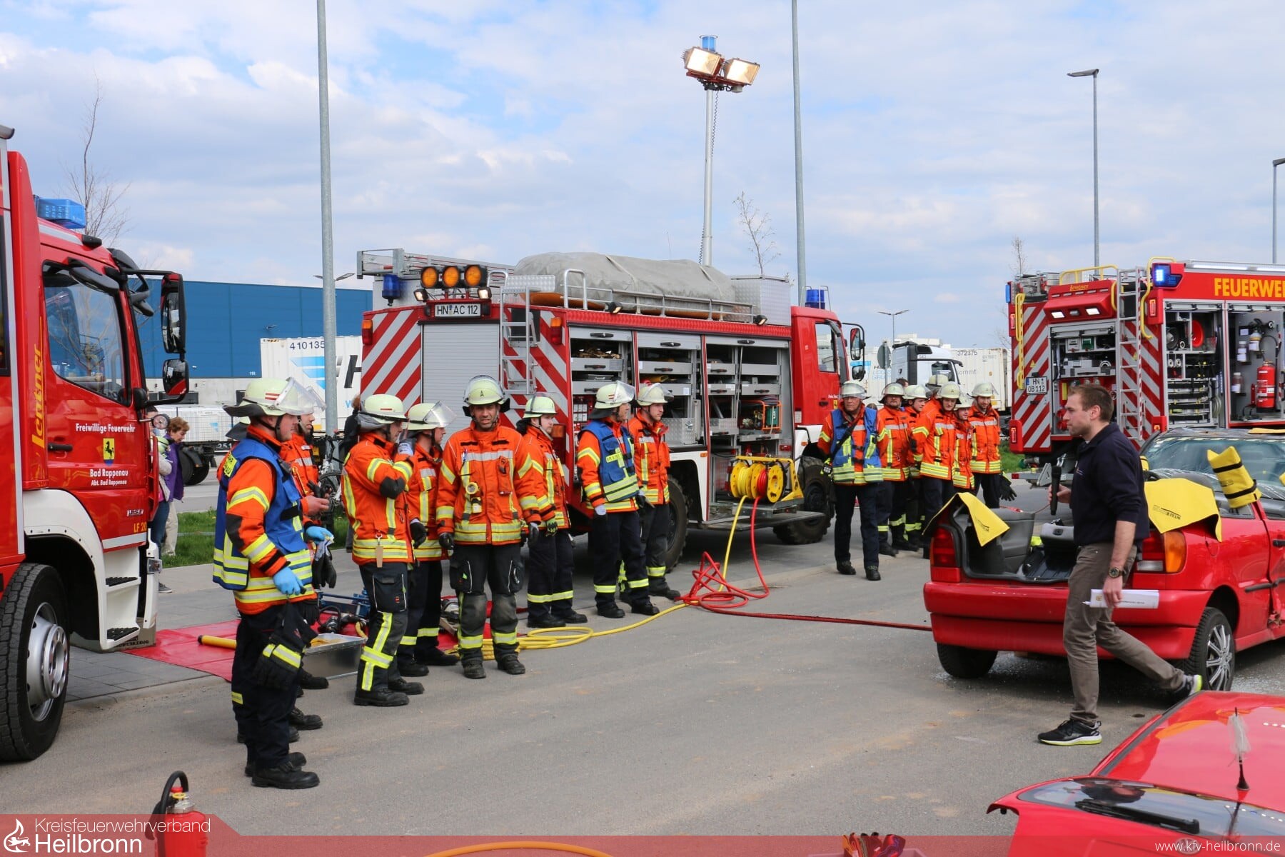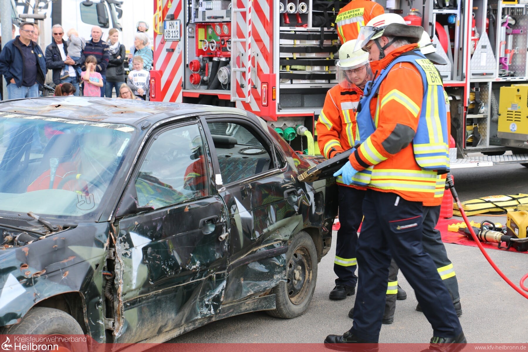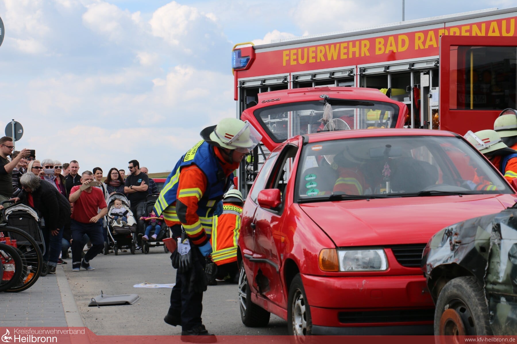 Nachmittags führten die Kameraden aus der Abt. Bad Rappenau mit Unterstützung von Kameraden der Abt. Süd eine Schauübung durch, es wurde ein Verkehrsunfall simuliert, bei welchem zwei Autos frontal aufeinandergeprallt sind und die Fahrer in Auto eingeklemmt waren. Felix Mann (Kommandant) erklärte während der Schauübung das Vorgehen der verschiedenen Einsatzgruppen und die eingesetzten Fahrzeuge.