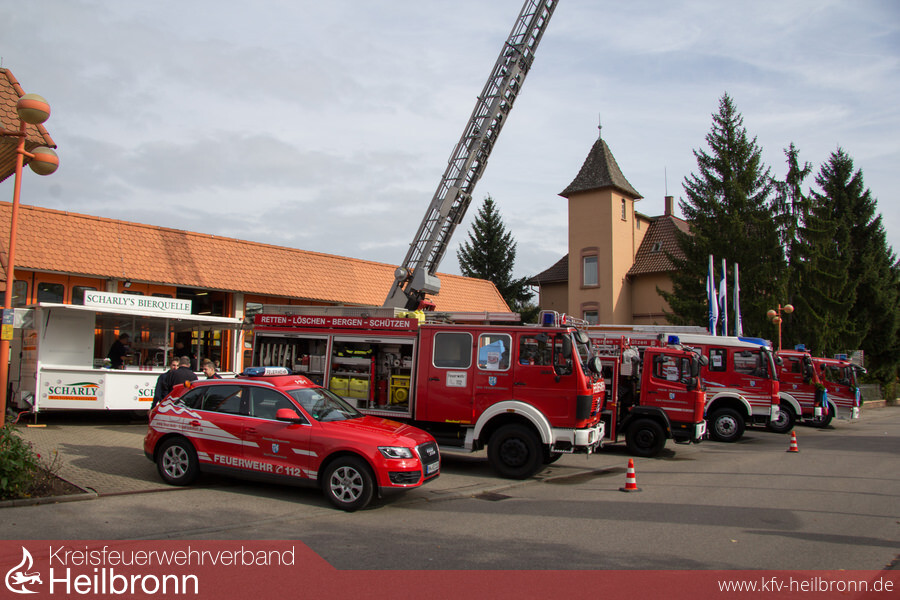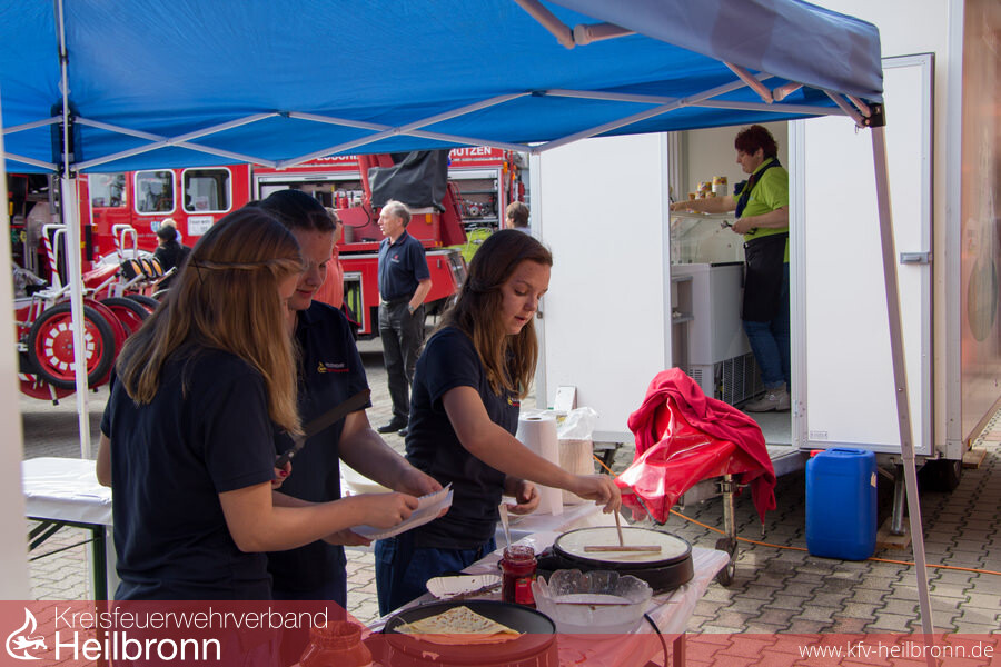 Neben Kommandowagen, Tanklöschfahrzeug, Drehleiter und Löschfahrzeug stand auch der neu eingeweihte Rüstwagen, sowie der Gerätewagen Transport für die großen und kleinen Besucher bereit. Weiter ging es im Innenhof des Gerätehauses mit den Attraktionen für die Kinder: Hüpfburg, Spritzenhäusle und Kisten stapeln. In der leergeräumten Fahrzeughalle konnte man sich zum Essen niederlassen und der Musik der Stadtkapelle Bad Friedrichshall, sowie nachmittags dem Feuerwehrspielmannszug Bad Friedrichshall lauschen. Die Auswahl bestand aus einem Mittagstisch, Kaffee und Kuchen und verschiedenen Crêpes, welche von der Jugendfeuerwehr gemacht wurden.