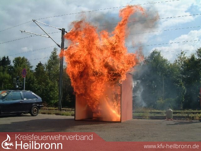 im nächsten Programmpunkt wurden die Auswirkungen einer Fettexplosion verdeutlicht. In einer extra für diesen Zweck gebauten Küche wurde brennendes Fett mit dem für dieses Feuer falschen Löschmittel, nämlich Wasser, bekämpft. Das Ergebnis war für die Zuschauer beindruckend.