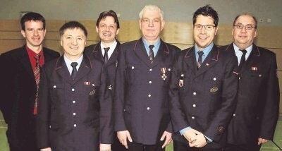Bild: Geehrt und gewählt: Bürgermeister Thilo Michler (von links), Kommandant Werner Bauer, Bezirksbrandmeister Frieder Lieb, Walter Beckh, Jugendwart Marco Wezstein, Kreisbrandmeister Uwe Vogel. (Foto: Werner Stuber)