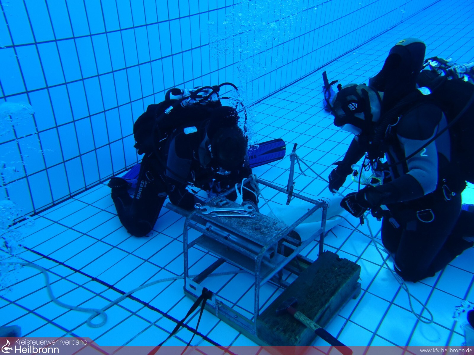 Zur Durchführung der „Einfachen Technischen Hilfeleistung“ unter Wasser wurde eigens ein Übungsgerät versenkt. Hieran galt es Knoten zu binden und vorgegebene Arbeiten mit verschiedenen Werkzeugen durchzuführen.