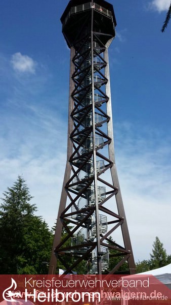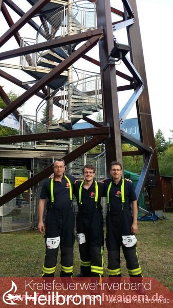 Drei Männer der Feuerwehr Schwaigern haben sich auf gemacht einen Turm mit kompletter Schutzausrüstung und Atemschutz in möglichst kurzer Zeit zu bezwingen. Matthias und David Ott sowie Marc Freudenthaler sind der Einladung der Feuerwehr Wilhelmsfeld gefolgt und haben sich entschieden, dass sie gemeinsam zum Teltschikturm-Treppenlauf starten.