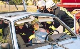 Die Einsatzleitung rund um den stellvertretenden Kommandanten Wolfgang Rauh hat das Gelände inzwischen in drei Abschnitte unterteilt. Ein Team kümmert sich um das fröhlich grinsende Unfallopfer von der Jugendfeuerwehr. Halskrause um, Schutzdecke gegen Splitter und dann ran mit der Schere ans Metall des Fahrzeugs.
