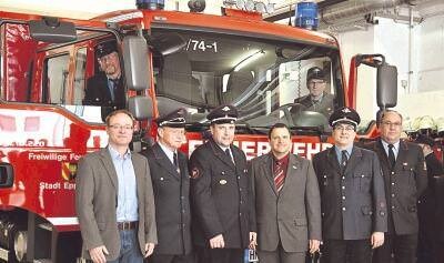 Bild: Die Feuerwehrspitze mit Martin Kuhmann (Zweiter von rechts) und OB Klaus Holaschke (Dritter von rechts) bei der Präsentation des Fahrzeugs. (Foto: Hettich)