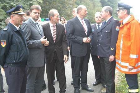 Bild: DFV-Vizepräsident Hartmut Ziebs (l.) und LFV-Präsident Hans Graulich (r.) ließen sich gemeinsam mit Bundesverkehrsminister Wolfgang Tiefensee von der Einsatzleitung informieren. Foto: Friedrich Kulke/DFV