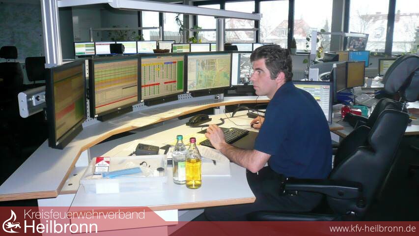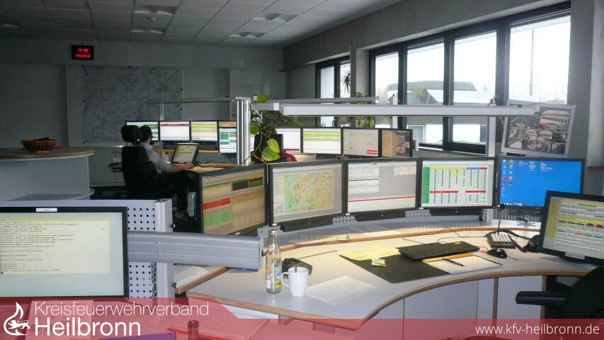 Den Disponenten stehen sechs gleichberechtigte Arbeitsplätze zur Verfügung. Ein Arbeitsplatz steht für die Gefahrenmeldeanlage und den Lagedienstführer bereit. Ein weiterer Arbeitsplatz, ist ein gleichberechtigter Schulungs- und Ausbildungsplatz. Letzterer dient auch als Medienplatz bei Führungsraumbetrieb.
