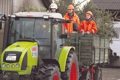 Bild: Hoch auf dem grünen Wagen: Die Jugendfeuerwehr des Bad Rappenauer Stadtteils Treschklingen lädt die erste Fuhre Weihnachtsbäume ab. (Foto: Gabriele Schneider)
