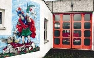 Bild: Das 28 Jahre alte Löschfahrzeug steht noch behütet vom heiligen St. Florian in der Halle. Dort soll das neue Fahrzeug einziehen. (Foto: Rudolf Landauer)