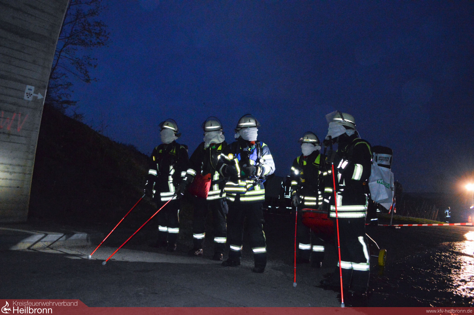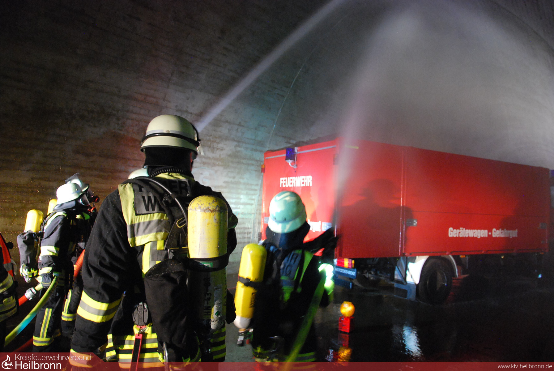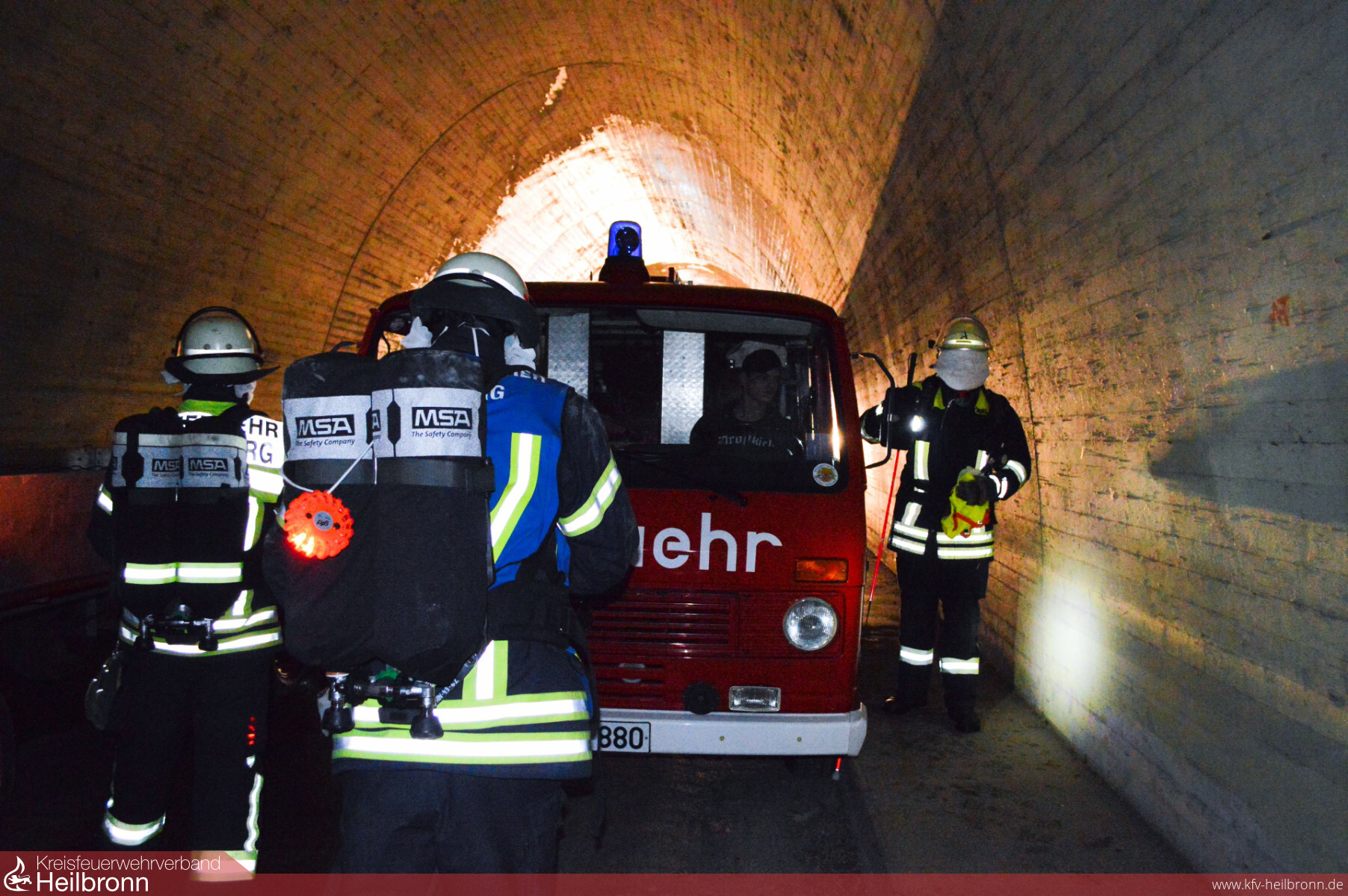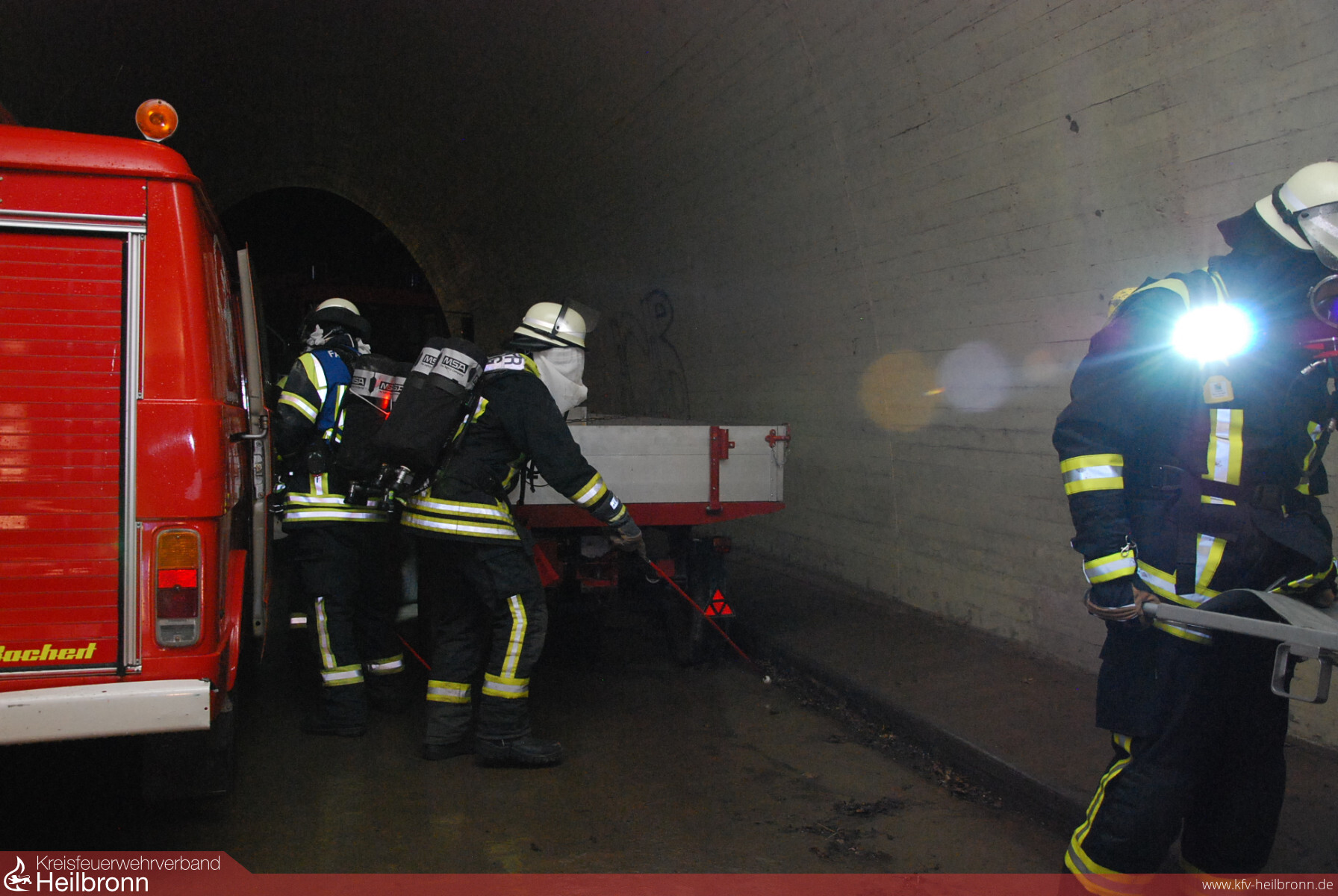 Auf Basis der erfolgten Ausbildung und der „Rauchfreiheit“ konnten sich die Übungseinsatzleiter schnell entscheiden, dass „Löschen und Kühlen“ von der Weinsberger Tunnelseite erfolgen musste. Die zugeteilte Mannschaft nahm dementsprechend einen Löschangriff mit dem Tanklöschfahrzeug und zwei C-Rohren vor. Das Thema „Suchen und Retten“ wurde von den Kameraden am anderen Tunnelportal mit dem Hilfeleistungslöschfahrzeug abgearbeitet. Um zum einen eine möglichst reale Situation zu simulieren, zum anderen aber auch um beobachtende Kameraden und die angrenzende Autobahn nicht zu behindern, wurde auf eine künstliche Verrauchung verzichtet und den hier agierenden Kräften stattdessen die Augen verbunden. Mithilfe von Blindenstöcken und einer Wärmebildkamera konnte die Staffel schließlich sieben freiwillige „Opfer“ retten.