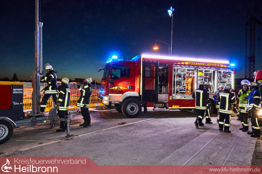 Am Montag Abend, den 27.3.2017 um 20 Uhr gab es an der Baustelle Grundinstandsetzung der linken Kammer und Ausbau der Liegenstelle der Schleuse Lauffen eine Großübung der örtlichen Feuerwehr um den Ernstfall zu proben.