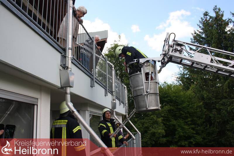 Bild: Mit der Drehleiter aus Oberstenfeld wird die Beilsteiner Feuerwehr eine Bewohnerin aus dem Haus Ahorn über den Balkon „retten“. Foto: Barbara Barth