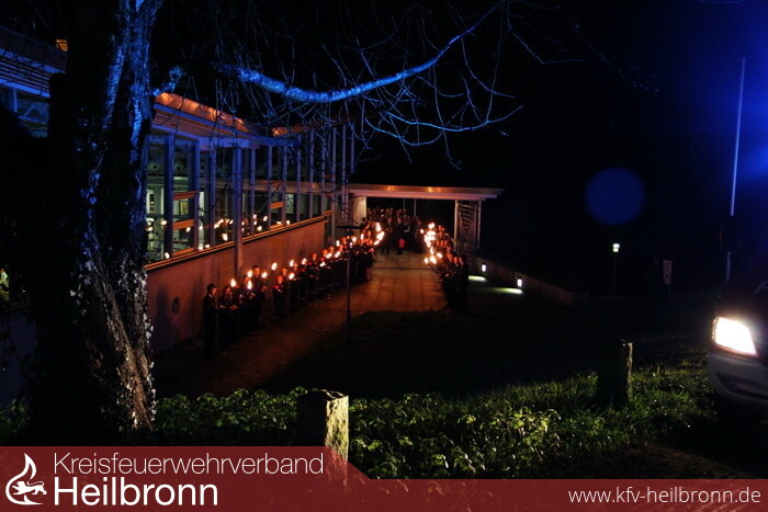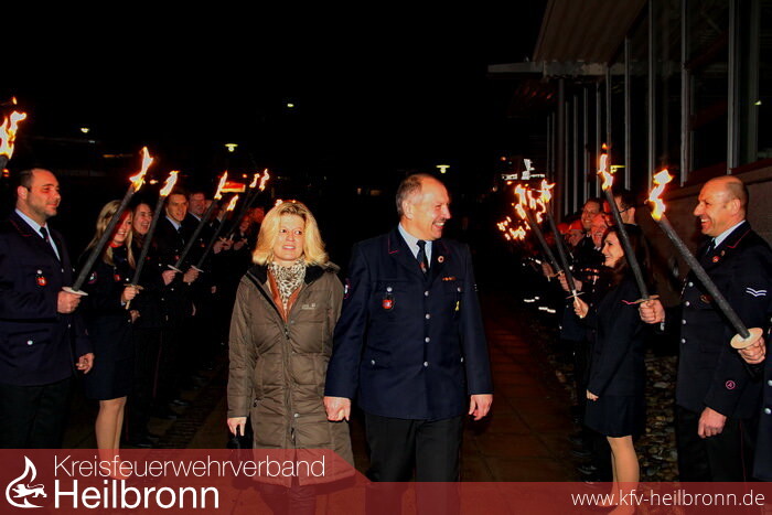 Bis zuletzt behandelten alle die Einladung vertraulich. So war Uwe Thoma sichtlich überrascht, als er von seiner Frau Birgit am Abend in die Jagsttalhalle gebracht und dort von einem Fackelspalier aus Jugendfeuerwehr und Feuerwehrangehörigen begrüßt wurde.