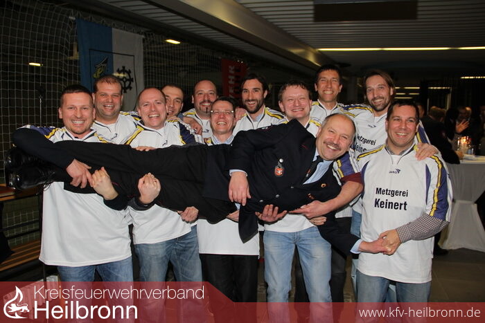 Die Feuerwehrkameraden aus Gochsen gaben in einem Sketch die „Glocken von Rom“ zum Besten, und als keiner mehr mit weiteren Gästen rechnete, kamen die von Uwe Thoma von 1984 – 1994 betreuten Fußballer der SG Hardthausen-Lampoldshausen vorbei, um „ihrem“ Uwe zu gratulieren.