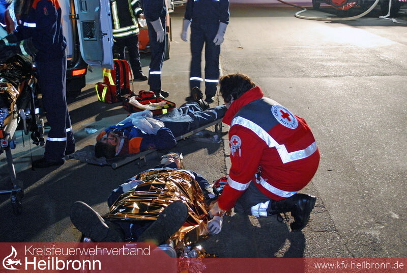 Mehrere Trupps unter Atemschutz begannen nach dem Eintreffen an der Übungsstelle umgehend mit der Suche nach den Vermissten. Mit Hilfe der Wärembildkamera konnten diese schließlich in dem weitläufigen Gebäudebereich lokalisiert und nach und nach ins Freie gebracht werden. Dort wurden sie von den DRK Kräften übernommen, erstversorgt und anschließend in Krankenhäuser gebracht.