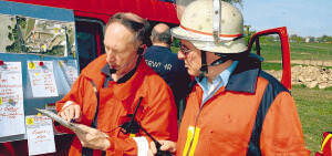 Bild: Gerhard Kupfer (li.) und Kurt Semen hatten die Einsatzleitung. Wegen der Waldbrandgefahr hielt die Feuerwehr auch die Umgebung im Auge. (Foto: Peter Klotz)